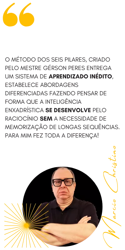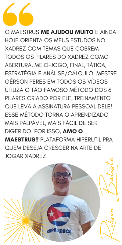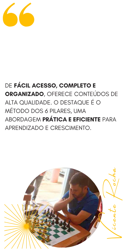 Tudo que foi gravado pelo Mestre Gérson Peres de videoaulas longas de xadrez (mais de 30 minutos) e o material de apoio delas com os PGNs e Ebooks integram a ASSINATURA VITALÍCIA DO MÉTODO DOS 6 PILARES.